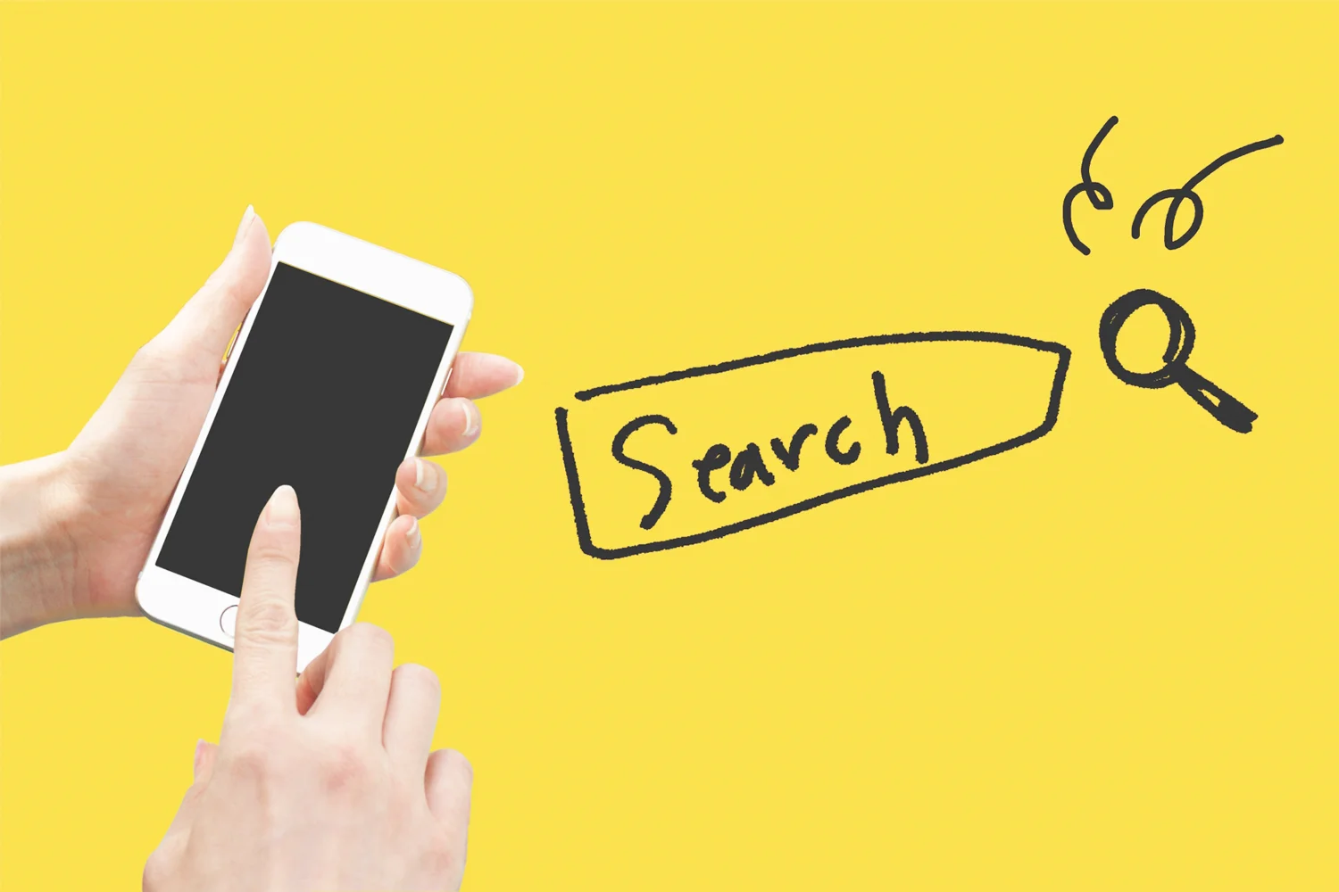 「〇〇で検索」というフレーズを、スマートフォンの検索窓を模した枠の中に配置します。人間は空白を埋めたくなる心理があるため、この視覚的フックだけで検索リフト値(検索の上昇率)が大きく変わります。