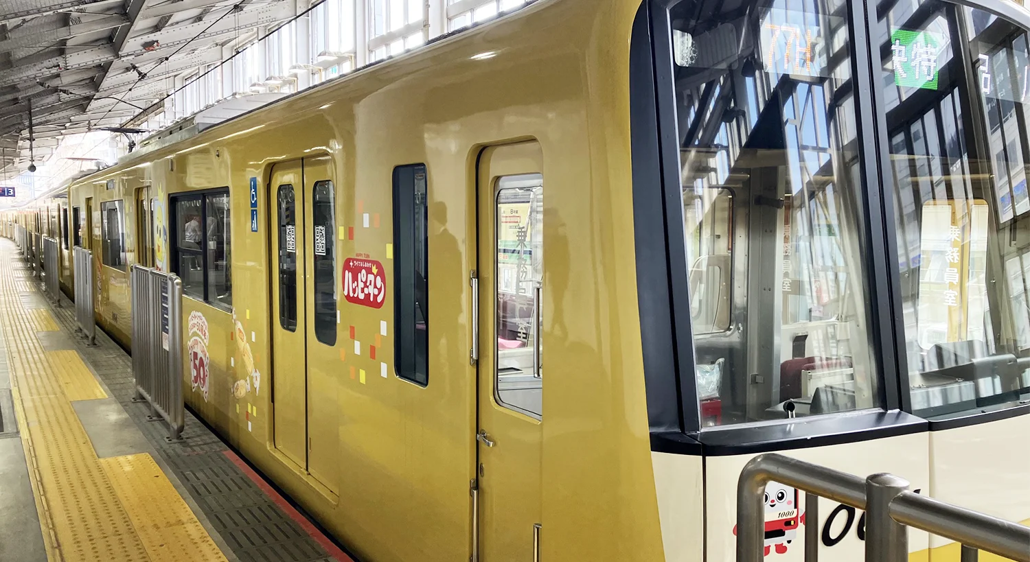 その象徴ともいえるのが、この「京急イエローハッピートレイン」である。この特別列車は、鮮やかな黄色を基調とし、車内には亀田製菓の人気商品「ハッピーターン」の中吊り広告が彩る。外装・内装ともにハッピーターンに登場するキャラクター「ターン王子」の愛らしいデザインがあしらわれ、乗客を笑顔に包み込む。